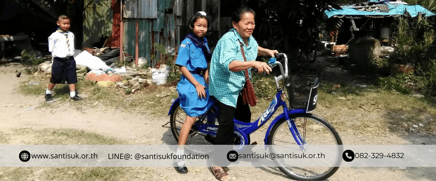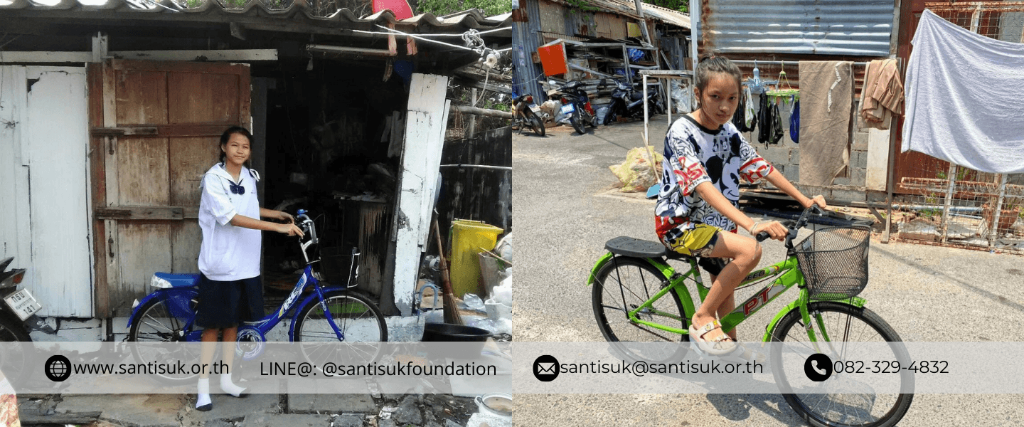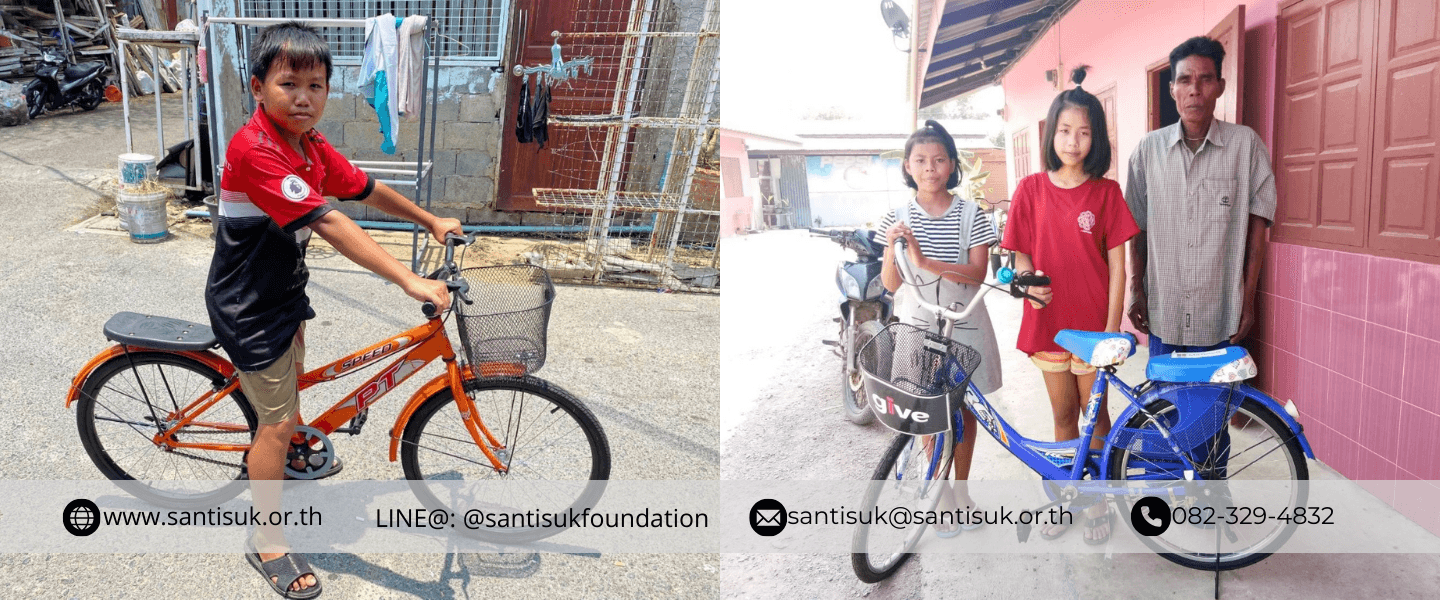 เด็กๆ หลายคนในโครงการเพื่อทุนการศึกษา ต้องประสบกับปัญหาการเดินทางไปโรงเรียน บางคนต้องเดินไปโรงเรียน ระยะทางหลายกิโลเมตร เนื่องจากความขัดสน และครอบครัวที่ยากจน ไม่มีรายได้เพียงพอที่จะดูแลค่าพาหนะให้กับเด็กๆ มูลนิธิสันติสุข และทีมงานจึงใคร่ขอการสนับสนุนจากทุกท่าน ร่วมบริจาคเงินสมทบเข้ากองทุน ค่าพาหนะ "ส่งน้องไปโรงเรียน" จำนวนเงิน 500 บาท /เดือน/เด็ก 1 คน หรือ บริจาคเป็น จักรยาน เพื่อให้น้องสามารถใช้เป็นพาหนะเดินทางไปโรงเรียน ในกรณีที่เส้นทางปลอดภัย อันเป็นการสนับสนุนให้น้องๆ ผู้ด้อยโอกาส มีกำลังใจเดินทางไปโรงเรียนอย่างสม่ำเสมอทุกวัน
