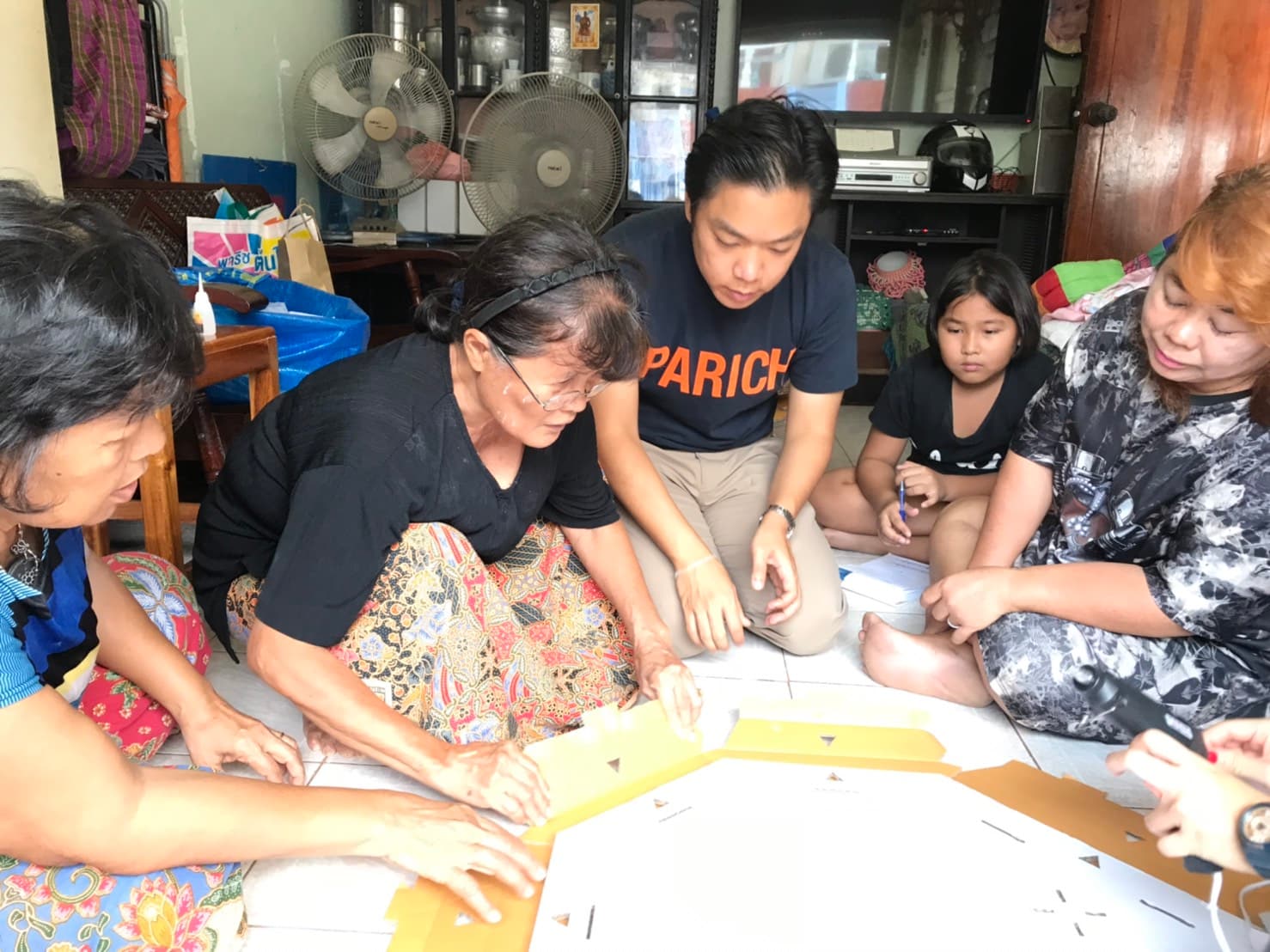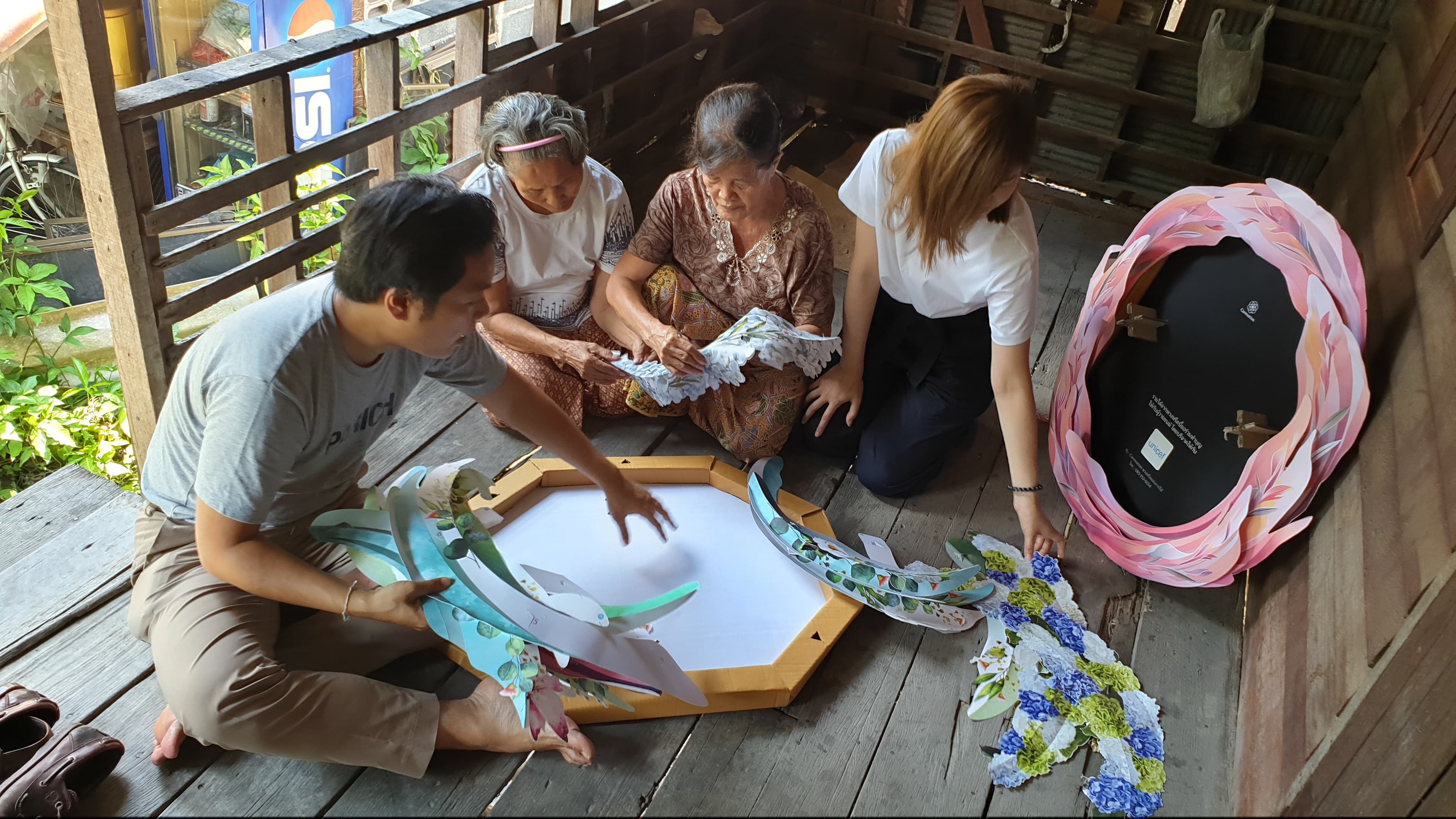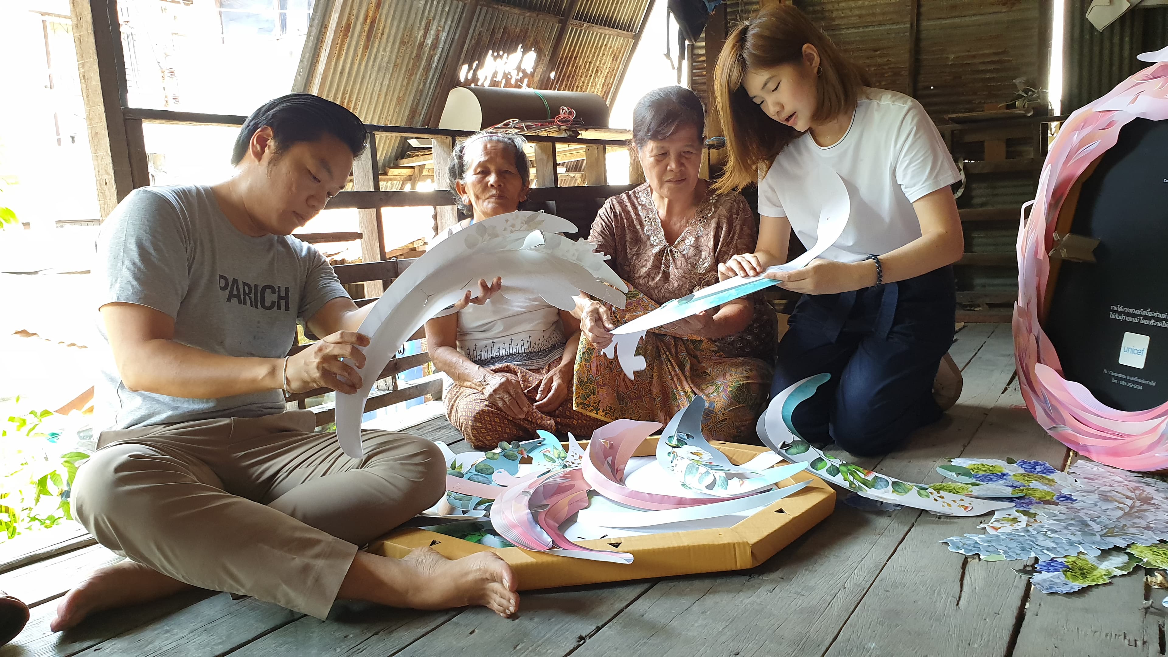 การออกแบบพวงหรีดของเราจึงเอาโจทย์นี้เป็นตัวตั้ง โดยพวงหรีดทุกพวงถูกออกแบบให้แยกชิ้นส่วนเป็นชิ้น แล้วมาประกอบได้ทีหลัง แทนที่จะออกแบบให้ประกอบเสร็จจากเครื่องจักรในโรงงานทั้งพวง ซึ่งการทำแบบนี้จะทำให้ต้นทุนเราสูงขึ้นมาก แต่การแยกชิ้นนี้กลับทำให้เราสามารถมอบงานให้ชุมชนได้ โดยเราออกแบบให้พวงหรีดนั้นประกอบง่าย คนไม่มีทักษะ เด็ก หรือคนชราก็ประกอบได้ จึงเป็นรายได้เสริมสำหรับคนที่ต้องการมีอาชีพ และมีรายได้เพิ่มเติมไปจุนเจือครอบครัว