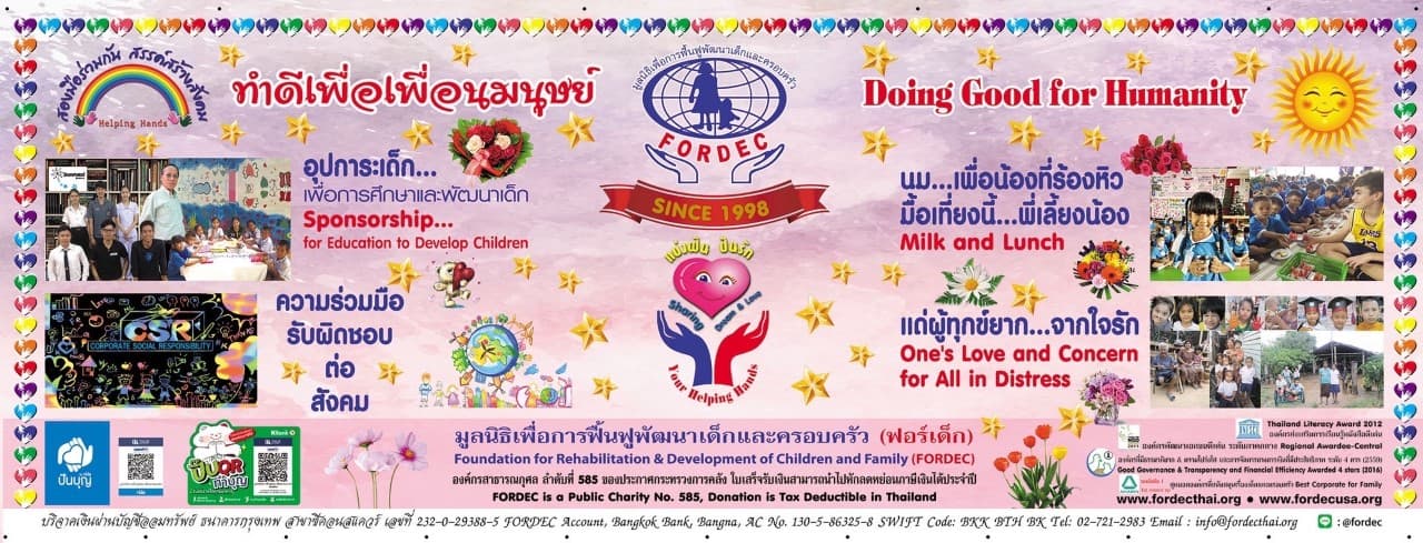 เป็นองค์กรสาธารณกุศล ลำดับที่ 585 ก่อตั้งเมื่อ 14 กุมภาพันธ์ 2541 ดำเนินกิจกรรมเพื่อช่วยเหลือเด็กด้อยโอกาส ครอบครัวผู้ทุกข์ยาก และผู้ซึ่งอยู่ในภาวะยากลำบาก เพื่อยกระดับคุณภาพชีวิตที่ดีขึ้น ผ่านโครงการเพื่อการศึกษาและพัฒนาเด็ก ส่งเสริมการเรียนรู้ ศูนย์พัฒนาเด็กเล็ก งานด้านการบริการและสังคมสงเคราะห์เด็กและครอบครัว ความร่วมมือรับผิดชอบต่อสังคม (CSR) และอาสาสมัคร โดยมิจำกัดเชื้อชาติและศาสนา ภายใต้คำขวัญการดำเนินงาน ที่ว่า “แด่ผู้ทุกข์ยาก...จากใจรัก”